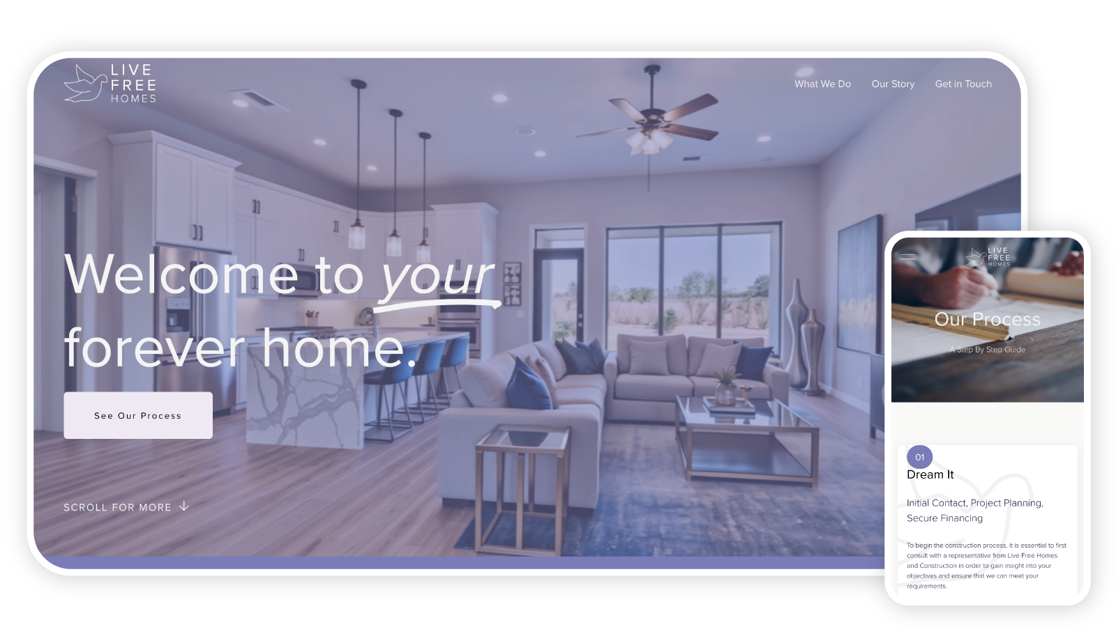 The palette was not an accident, nor was it purely aesthetic. Color communicates before copy does, and the question I was designing around was simple: what should someone feel when they first encounter this brand? Not the ruggedness of construction. Not the anxiety of a major financial decision. Comfort. The same feeling the home itself is supposed to deliver. The lavender was the answer, and it did double duty: it signaled calm to prospective homebuyers, and it made Live Free visually impossible to confuse with any competitor in the market.